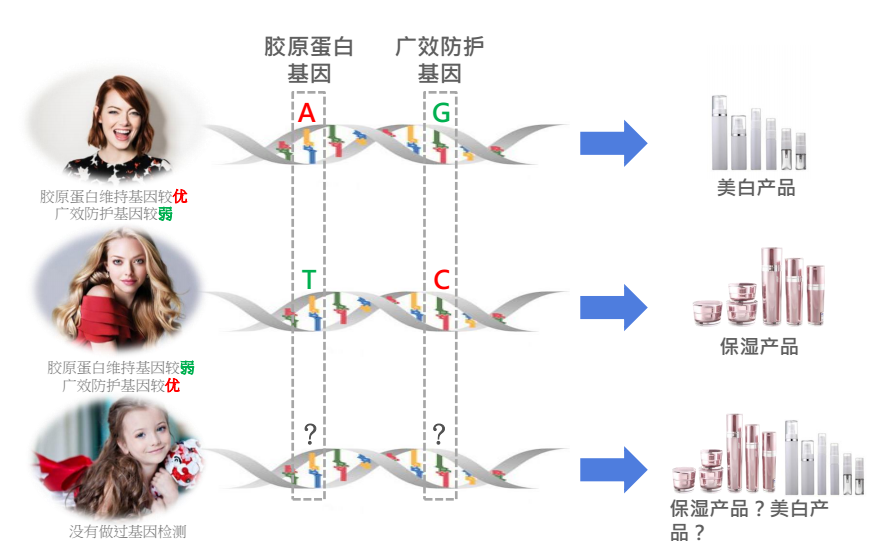 通过基因检测技术,能够对客户的皮肤与身体状况有一个深度评估,能够指导女性正确选择护肤品及美容产品,在医学美容方面提供更符合客户个体需求的美容方案。